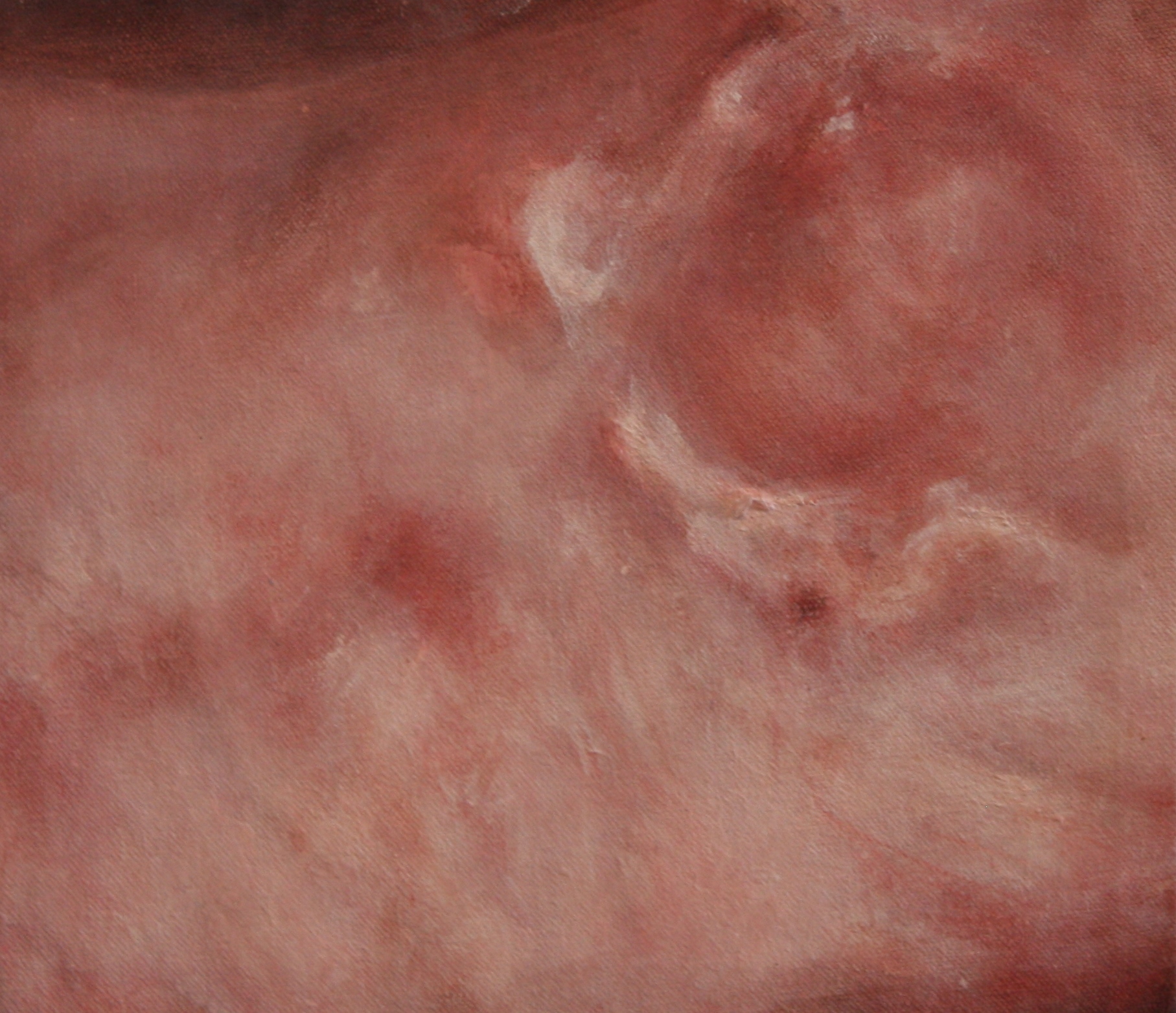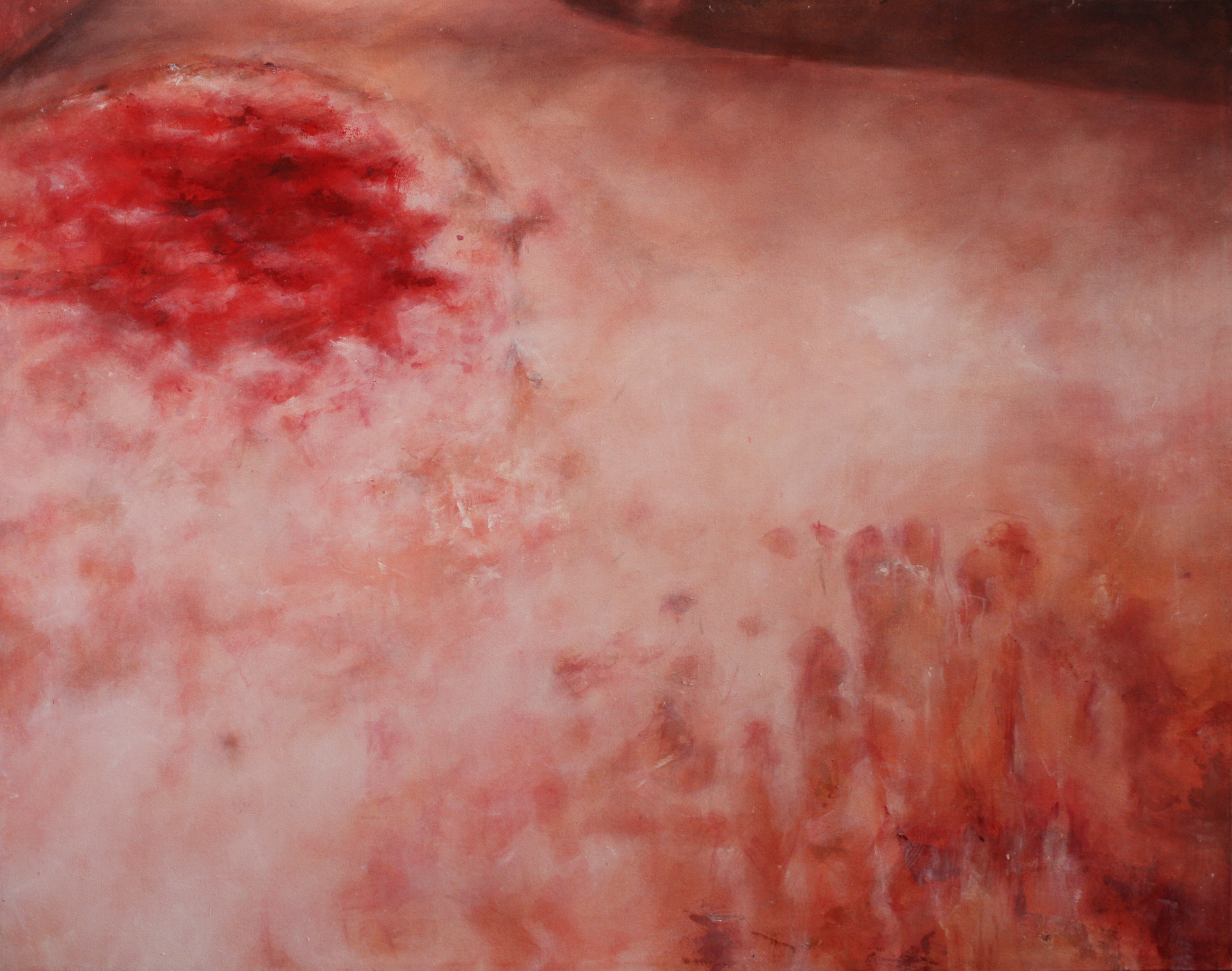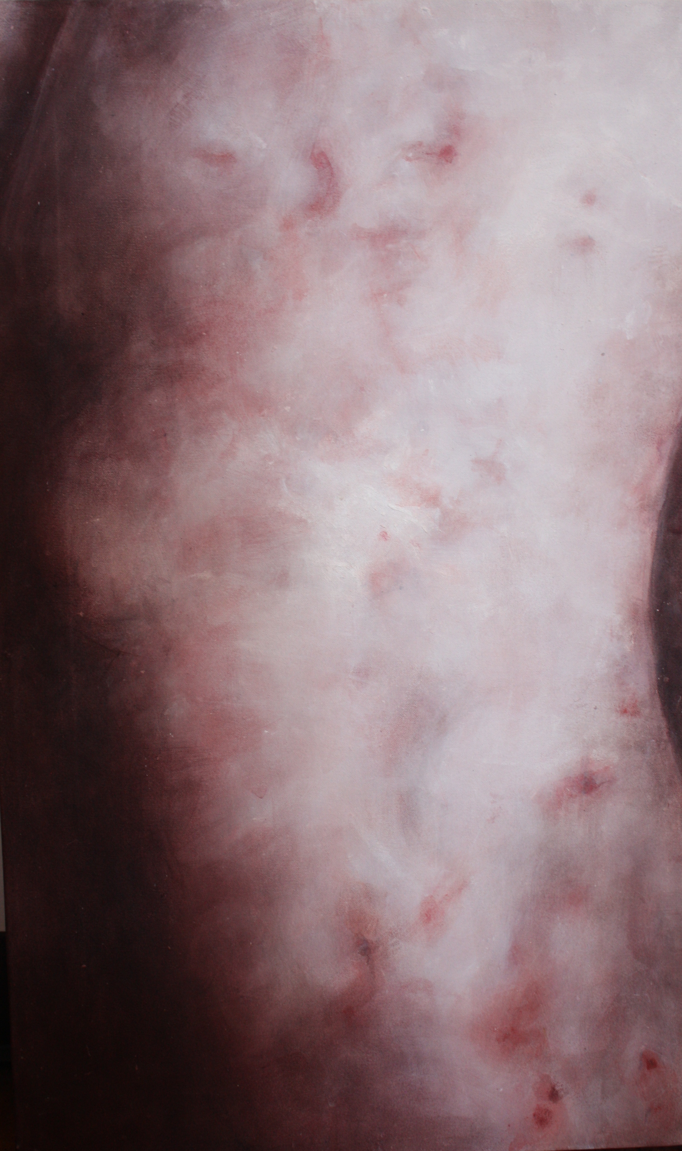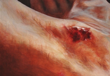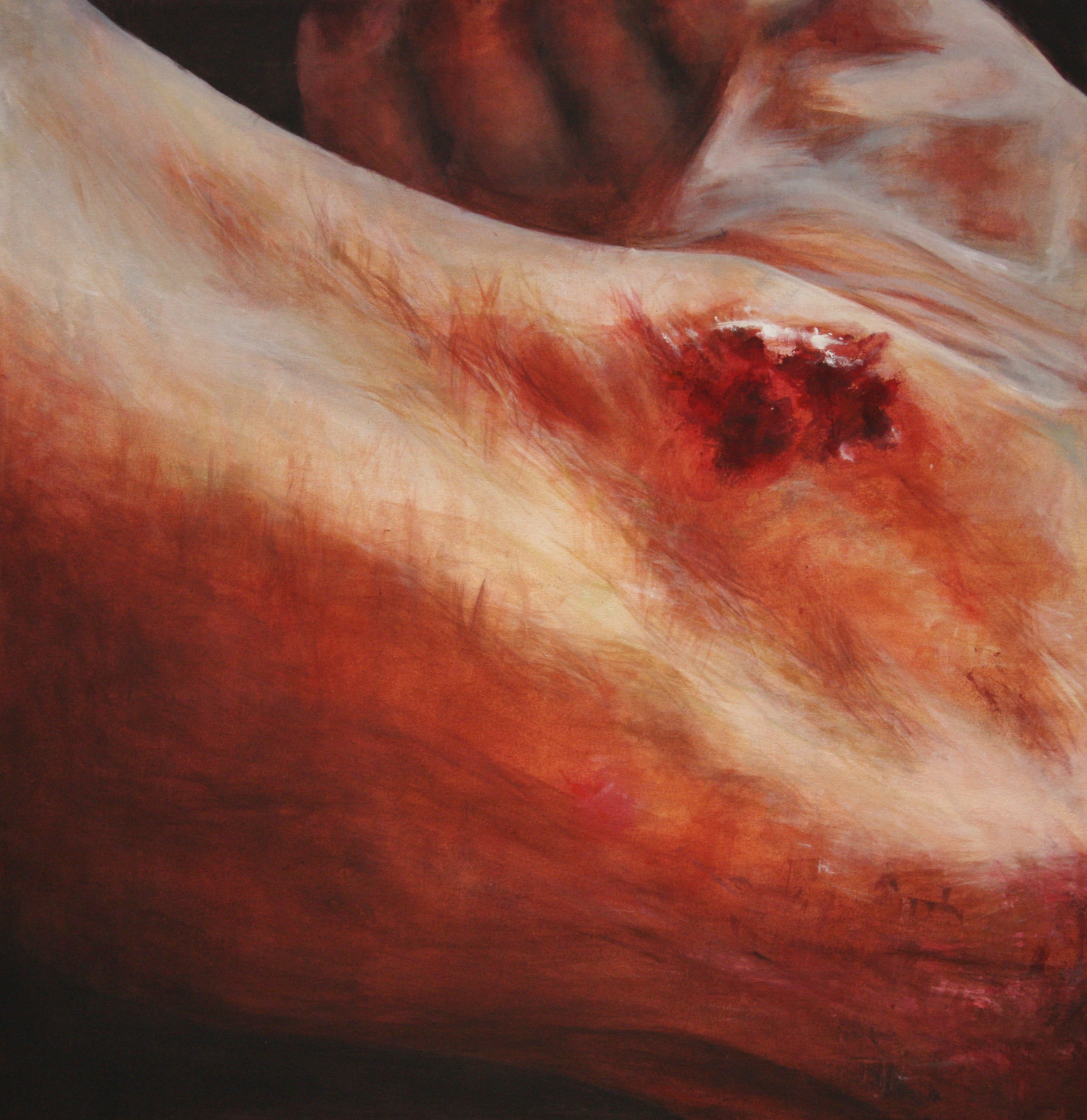 This series of paintings translates my own small wounds to canvas, focusing both on the wince-worthy aspects of broken and bruised flesh and the beauty found in the healing process. In addition to being a collection of very intimate self-portraits, my work examines the wear our skin goes through on a daily basis and the way the world physically marks us.